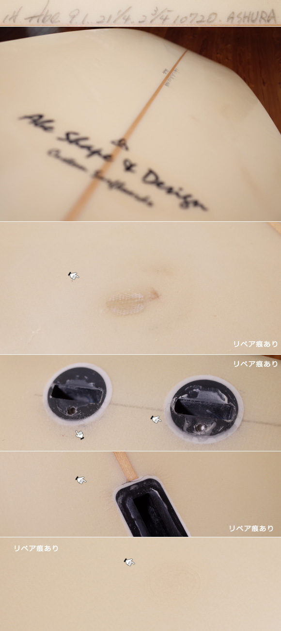 デッキ面はフットマーク、ヘコミは大小それなりにあり使用感は感じます。ボトムはヘコミやエクボなど多少あります。全体的に日焼けや、保管による経年の黄ばみもやや目立ちます。浸水の可能性のある傷は全てしっかりリペア済みでもちろん浸水の心配はありません。写真画像に掲載のようなテール、レール、ノーズ、ボトム、フィンカップ周辺などに多数のリペア痕あります。フィンカップに関してはリペアしているので強度的問題ないレベルではあると思います。目立ったリペア痕は写真に掲載しておりますが、細かなリペア痕は写真には掲載しておりません。全てリペア済みですのでご安心ください。もちろんリペアもその場しのぎの簡易補修ではなく、クロス補強など手を抜かずしっかりリペアされております。もちろん使用上の問題も無くそのままサーフィンできます!コンディションはそれなりにで激安商品として利益度外視で販売している商品ですのでご了承の上ご検討願います。細かいことは気にしないとにかく安くサーフボードを購入したいといった方向けです。