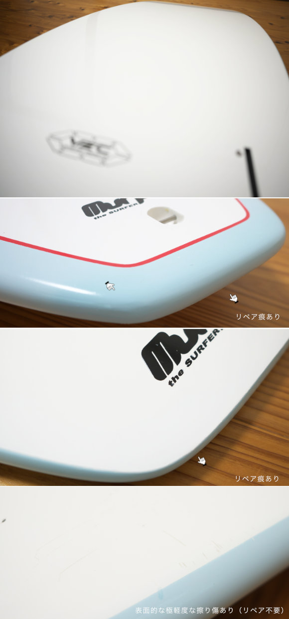 デッキ面は極軽度なヘコみ、フットマークがありますが、全体的に綺麗。ボトムは目立たヘコミがも無くとても綺麗。ノーズとテール周辺に4ヶ所軽度リペア痕がありますが、しっかりリペアされています。見た目も、あまり目立たないと思います。もちろん浸水等の心配もありません。コンディションは良好で、もちろん使用上の問題もなく、そのままサーフィンできます!